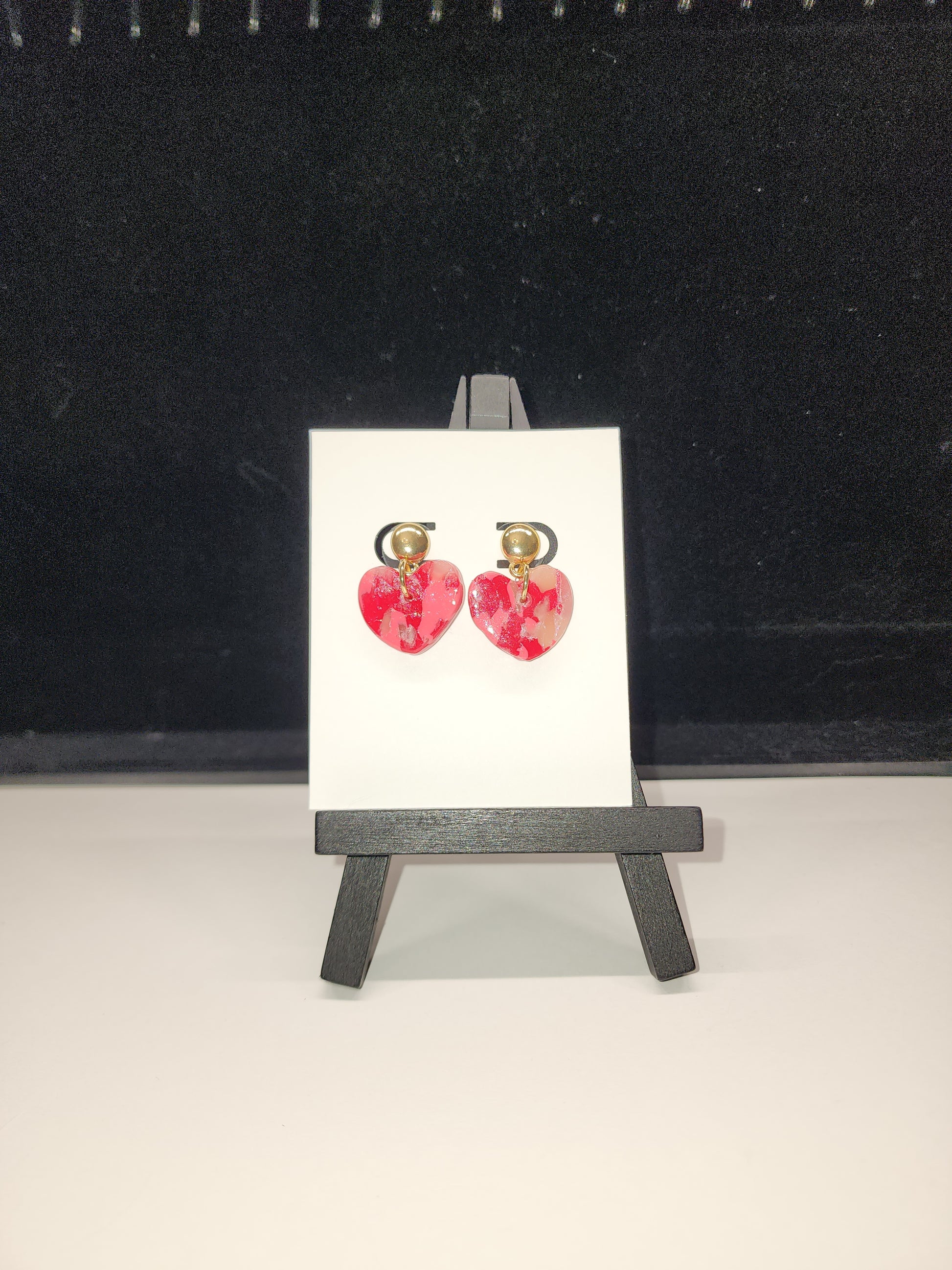 Red,pink, and translucent polymer clay glazed with resin, gold tone posts, nickel free findings. Colors and patterns may vary