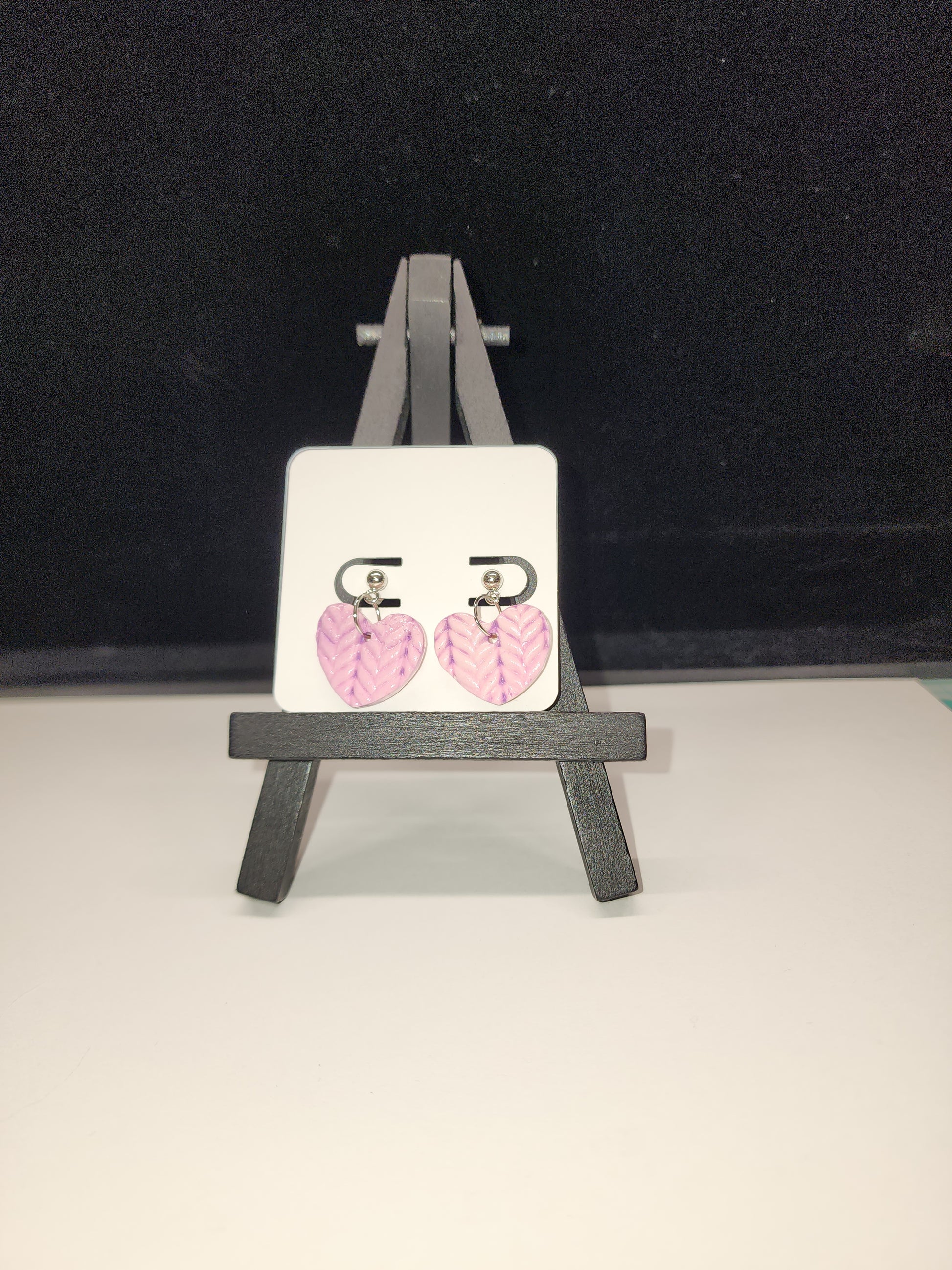 Pink polymer clay with sweater texture, antiqued with lavender paint sealed with acrylic glaze. Nickel free posts and rings. Colors and patterns may vary